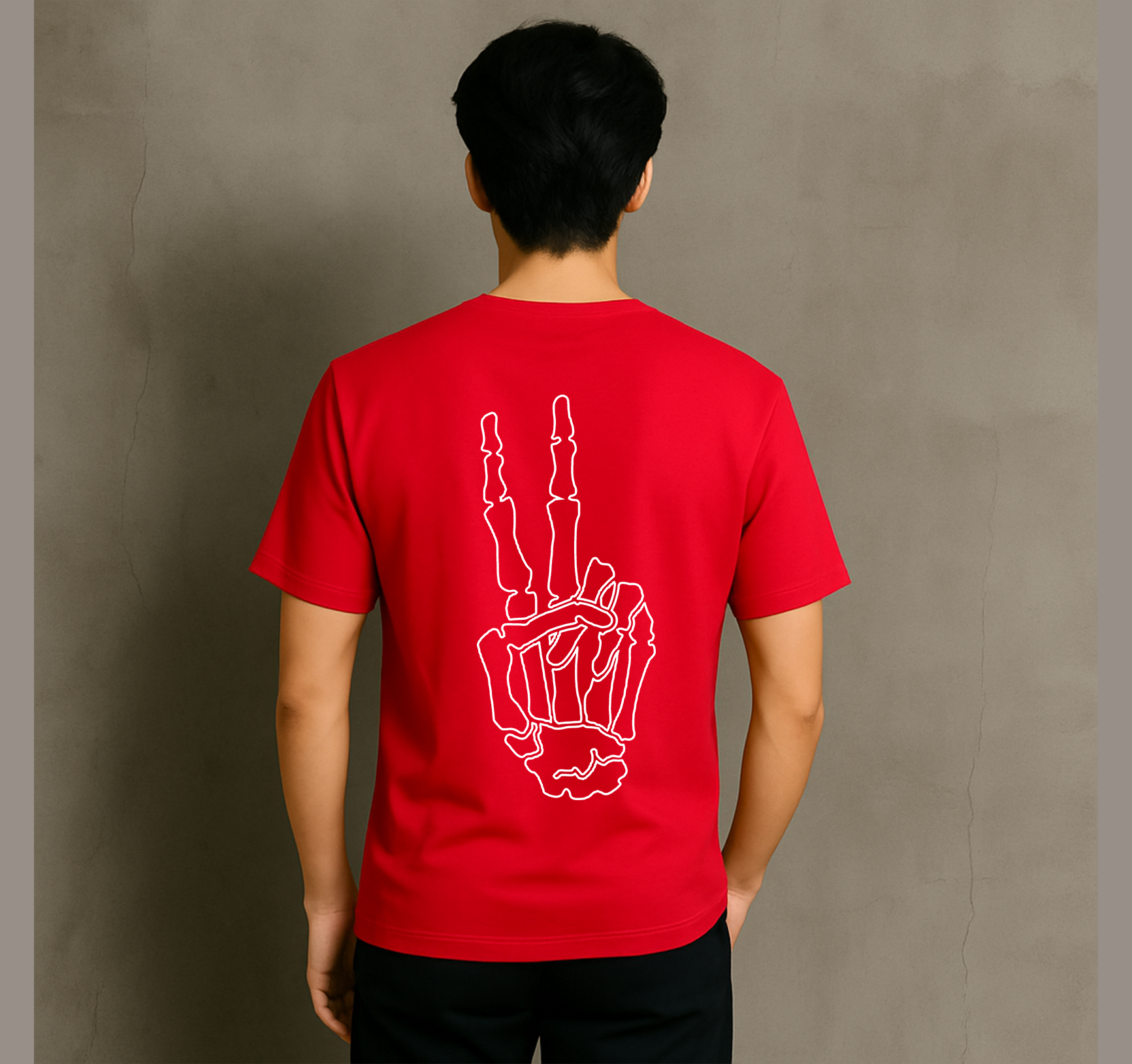 Who says bones can’t brag? This tee features a skeletal hand flashing the iconic victory gesture—two fingers up, zero chill down. It’s a graphic salute to triumph, rebellion, and the kind of confidence that doesn’t need skin to shine. Whether you’re celebrating small wins or just vibing with your inner punk, this shirt is your wearable mic drop. Minimalist, edgy, and eerily empowering.